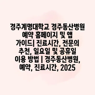 경주계명대학교 경주동산병원 예약 홈페이지 및 앱 설명서| 진료시간, 전연락 추천, 일요일 및 공휴일 이용 방법 | 경주동산병원, 예약, 진료시간, 2025에 대한 내용을 알려알려드리겠습니다. 경주동산병원은 최신의료기술과… 더 보기 »경주계명대학교 경주동산병원 예약 홈페이지 및 앱 가이드| 진료시간, 전문의 추천, 일요일 및 공휴일 이용 방법 | 경주동산병원, 예약, 진료시간, 2025