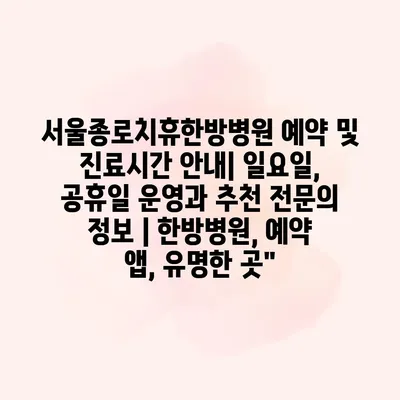 서울종로치휴한방병원 예약 및 진료시간 안내 서울종로치휴한방병원은 서울 도심에 위치한 전문 한방병원으로, 환자 중심의 진료를 알려알려드리겠습니다. 진료시간은 평일 오전 9시부터 오후 6시까지이며, 일요일과 공휴일에도 운영하여 많은… 더 보기 »서울종로치휴한방병원 예약 및 진료시간 안내| 일요일, 공휴일 운영과 추천 전문의 정보 | 한방병원, 예약 앱, 유명한 곳”