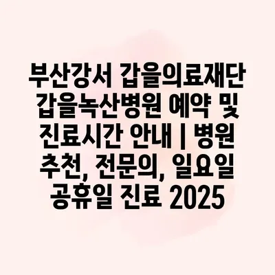 부산강서 갑을의료재단 갑을녹산병원 예약 및 진료시간 안내 | 병원 추천, 전문의, 일요일 공휴일 진료 2025