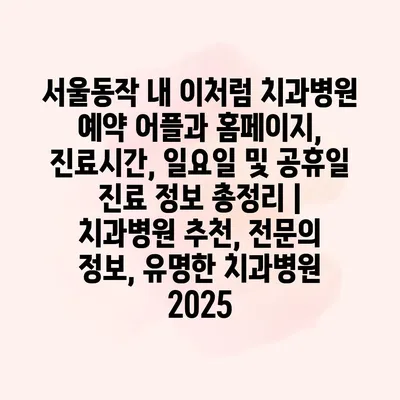 서울동작 내 이처럼 치과병원 예약 어플과 홈페이지, 진료시간, 일요일 및 공휴일 진료 정보 총정리 | 치과병원 추천, 전연락 정보, 유명한 치과병원 2025. 서울 동작구에는 여러… 더 보기 »서울동작 내 이처럼 치과병원 예약 어플과 홈페이지, 진료시간, 일요일 및 공휴일 진료 정보 총정리 | 치과병원 추천, 전문의 정보, 유명한 치과병원 2025