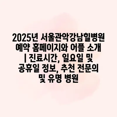 2025년 서울관악강남힐병원은 편리한 예약 시스템을 제공하는 홈페이지와 어플리케이션을 운영하고 있습니다. 이제 언제 어디서나 간편하게 진료 예약을 할 수 있으며, 사용자 친화적인 인터페이스 덕분에 쉽게 방문할… 더 보기 »2025년 서울관악강남힐병원 예약 홈페이지와 어플 소개 | 진료시간, 일요일 및 공휴일 정보, 추천 전문의 및 유명 병원