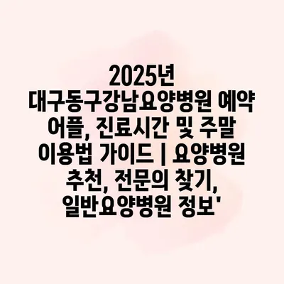 2025년 대구동구강남요양병원 예약 어플, 진료시간 및 주말 이용법 설명서 | 요양병원 추천, 전연락 찾기, 일반요양병원 정보 대구동구강남요양병원은 효율적인 예약 시스템을 알려드려, 환자와 보호자의 편리함을 최우선으로… 더 보기 »2025년 대구동구강남요양병원 예약 어플, 진료시간 및 주말 이용법 가이드 | 요양병원 추천, 전문의 찾기, 일반요양병원 정보’
