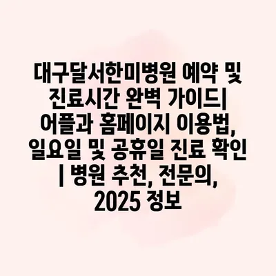 대구달서한미병원은 환자들에게 최상의 진료를 제공하기 위해 다양한 예약 시스템과 진료 시간을 운영하고 있습니다. 병원 홈페이지와 어플을 통해 간편하게 진료 예약을 할 수 있으며, 실시간으로 진료시간을… 더 보기 »대구달서한미병원 예약 및 진료시간 완벽 가이드| 어플과 홈페이지 이용법, 일요일 및 공휴일 진료 확인 | 병원 추천, 전문의, 2025 정보
