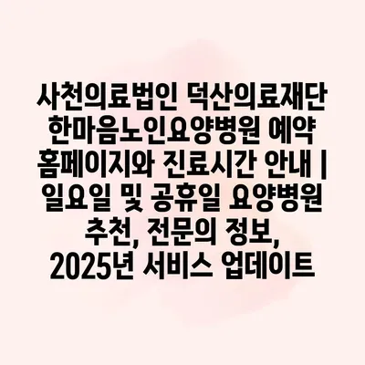 사천의료법인 덕산의료재단 한마음노인요양병원은 노인 환자를 위한 전문적인 치료와 편안한 환경을 알려알려드리겠습니다. 환자분들의 불편함을 최소화하기 위해 예약 홈페이지를 운영 중이며, 실시간 예약이 가능하여 손쉽게 방문 일정을… 더 보기 »사천의료법인 덕산의료재단 한마음노인요양병원 예약 홈페이지와 진료시간 안내 | 일요일 및 공휴일 요양병원 추천, 전문의 정보, 2025년 서비스 업데이트