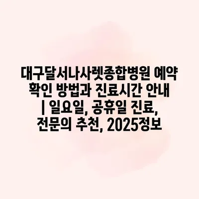 대구달서나사렛종합병원의 예약 확인 방법과 진료시간 공지에 대한 내용을 알려알려드리겠습니다. 예약 확인은 병원 공식 홈페이지 또는 전화로 할 수 있습니다. 홈페이지에 접속해 ‘예약 확인’ 메뉴를 클릭하면… 더 보기 »대구달서나사렛종합병원 예약 확인 방법과 진료시간 안내 | 일요일, 공휴일 진료, 전문의 추천, 2025정보
