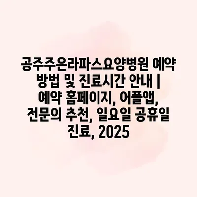 공주주은라파스요양병원 예약 방법 및 진료시간 공지 입니다. 예약은 홈페이지와 어플리케이션을 통해 간편하게 할 수 있습니다. 홈페이지에 접속하여 환자 내용을 입력 후, 원하는 진료 날짜와 시간을… 더 보기 »공주주은라파스요양병원 예약 방법 및 진료시간 안내 | 예약 홈페이지, 어플앱, 전문의 추천, 일요일 공휴일 진료, 2025