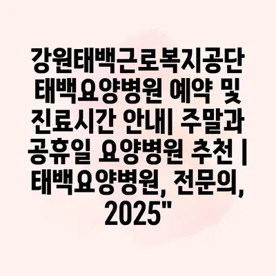 강원태백근로복지공단 태백요양병원 예약 및 진료시간 공지는 지역 내에서 신뢰받는 요양병원 중 하나입니다. 이 병원은 다양한 전연락들이 상주하여 최상의 진료를 제공하고 있습니다. 특히, 주말과 공휴일에도 진료… 더 보기 »강원태백근로복지공단 태백요양병원 예약 및 진료시간 안내| 주말과 공휴일 요양병원 추천 | 태백요양병원, 전문의, 2025″