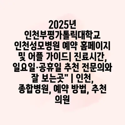 2025년 인천부평가톨릭대학교 인천성모병원 예약 홈페이지 및 어플 설명서를 통해서 보다 편리하게 진료를 받을 수 있는 방법을 공지제공합니다. 이 병원은 종합병원으로 다양한 분야의 전연락를 보유하고 있으며,… 더 보기 »2025년 인천부평가톨릭대학교 인천성모병원 예약 홈페이지 및 어플 가이드| 진료시간, 일요일·공휴일 추천 전문의와 잘 보는곳” | 인천, 종합병원, 예약 방법, 추천 의원