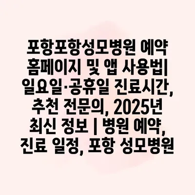 포항포항성모병원은 편리하게 예약할 수 있는 홈페이지 및 앱을 알려알려드리겠습니다. 사용자 친화적인 인터페이스로 누구나 쉽게 예약이 가능하며, 진료 일정도 손쉽게 확인할 수 있습니다. 일요일 및 공휴일… 더 보기 »포항포항성모병원 예약 홈페이지 및 앱 사용법| 일요일·공휴일 진료시간, 추천 전문의, 2025년 최신 정보 | 병원 예약, 진료 일정, 포항 성모병원